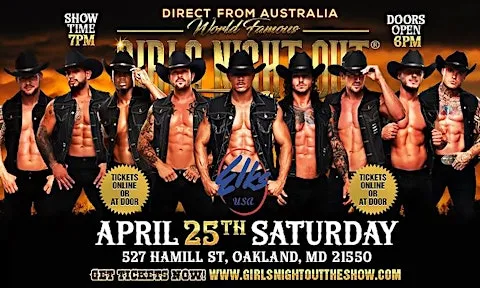 Girls Night Out Live Australia WORLD TOUR is hitting Oakland,MD for one night only!This is your chance to witness the Ultimate,high energy,jaw dropping,pulse-racing show LIVE!