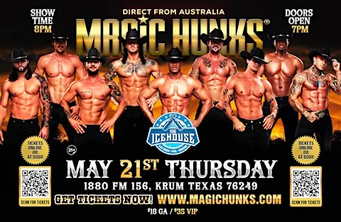 The Magic Hunks Australia WORLD TOUR is hitting Krum,Texas for one night only!This is your chance to witness the Ultimate,high energy,jaw dropping,pulse-racing show LIVE!