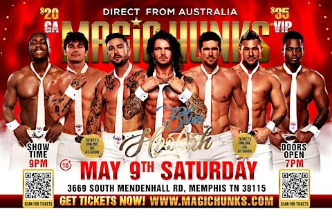 The Magic Hunks Australia WORLD TOUR is hitting Memphis,TN. This is your chance to witness the Ultimate, high energy ,jaw dropping,pulse-racing male revue show LIVE!