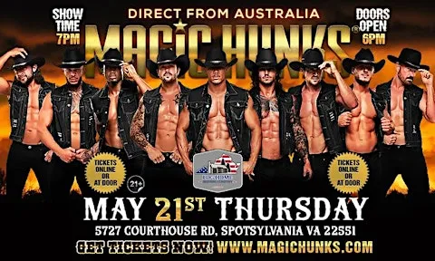 MAGIC HUNKS Live Australia WORLD TOUR is hitting Spotsylvania ,VA for one night only!This is your chance to witness the Ultimate,high energy,jaw dropping,pulse-racing show LIVE!