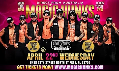 The Magic Hunks Australia WORLD TOUR is hitting St Pete,FL for one night only!This is your chance to witness the Ultimate,high energy,jaw dropping,pulse-racing show LIVE!