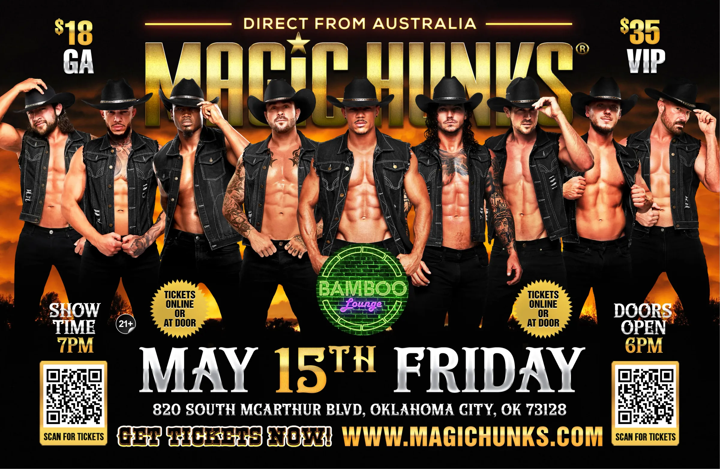 AUSTRALIA'S MAGIC HUNKS WORLD TOUR is hitting BAMBOO LOUNGE on Friday May 15th for one night only !This is your chance to witness the Ultimate, high energy, jaw dropping,pulse-racing show LIVE!