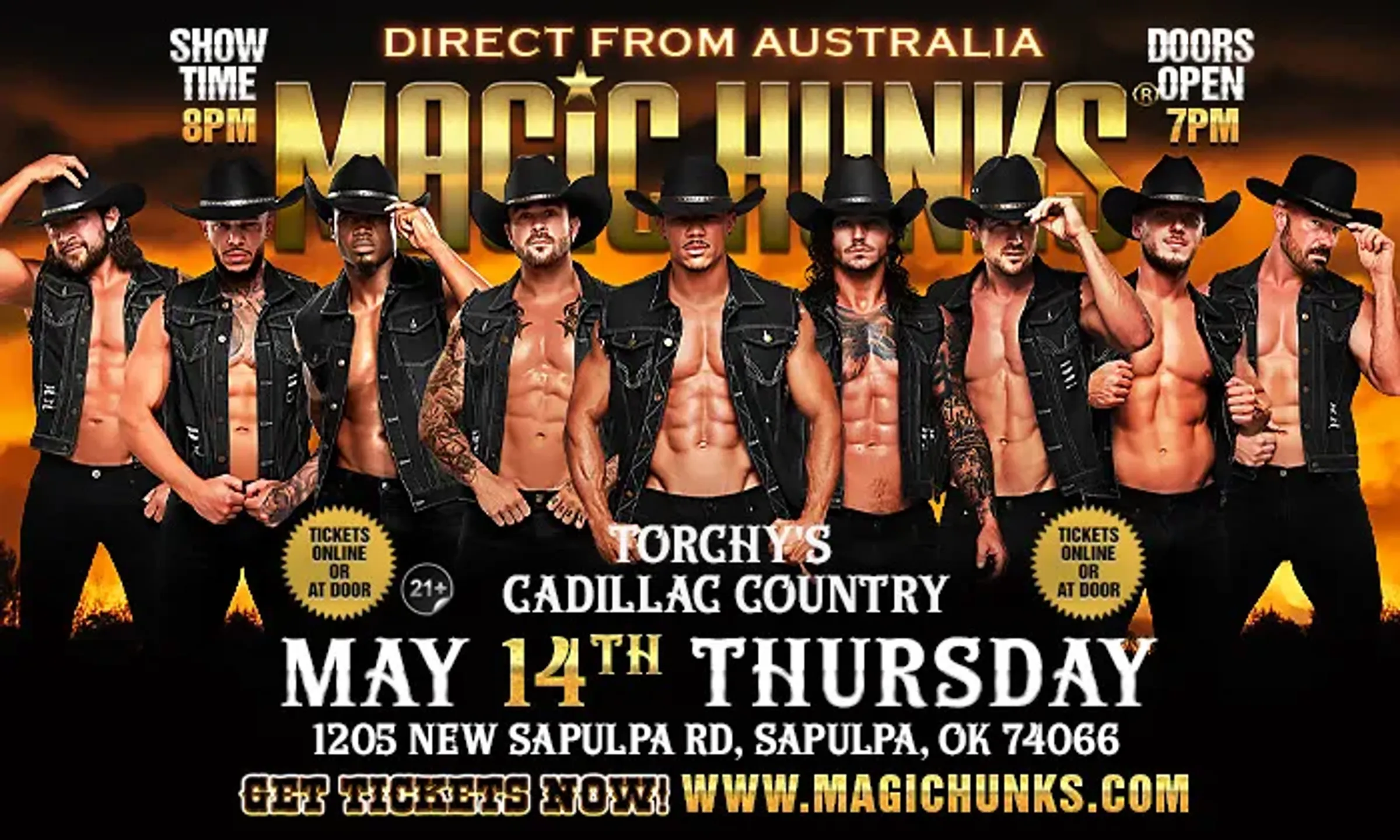 AUSTRALIA'S MAGIC HUNKS WORLD TOUR is hitting Torchy's Cadillac Country on Thursday May 14th for one night only !This is your chance to witness the Ultimate, high energy, jaw dropping,pulse-racing show LIVE!