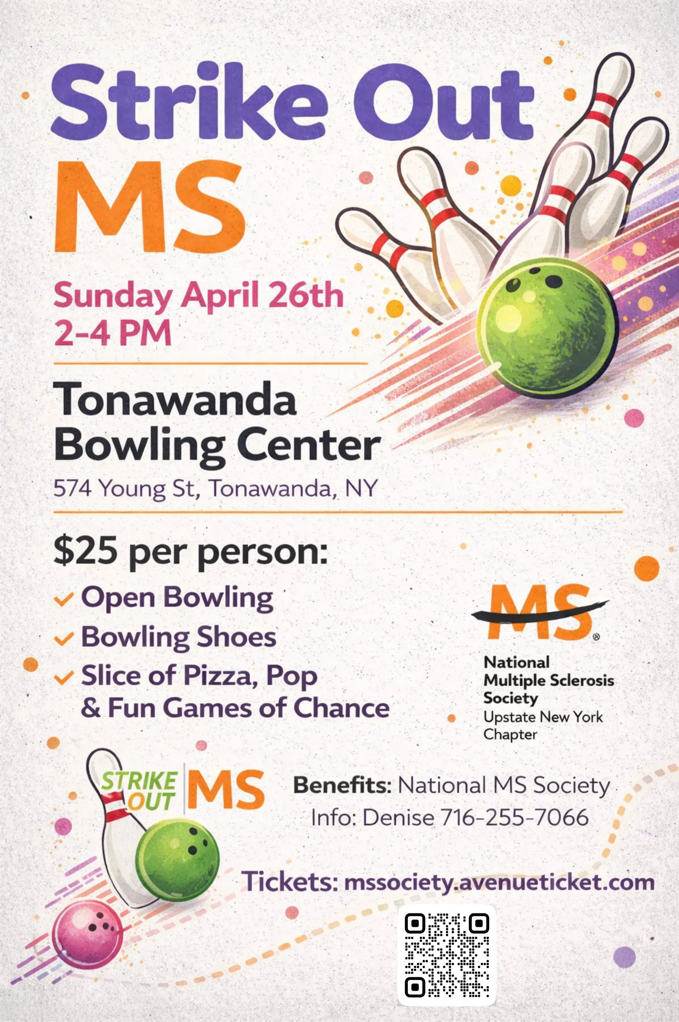 Join us for Strike Out MS, a fun community bowling event supporting the National Multiple Sclerosis Society. Bring your friends and family for an afternoon of bowling, food, and games while helping raise funds for an important cause.