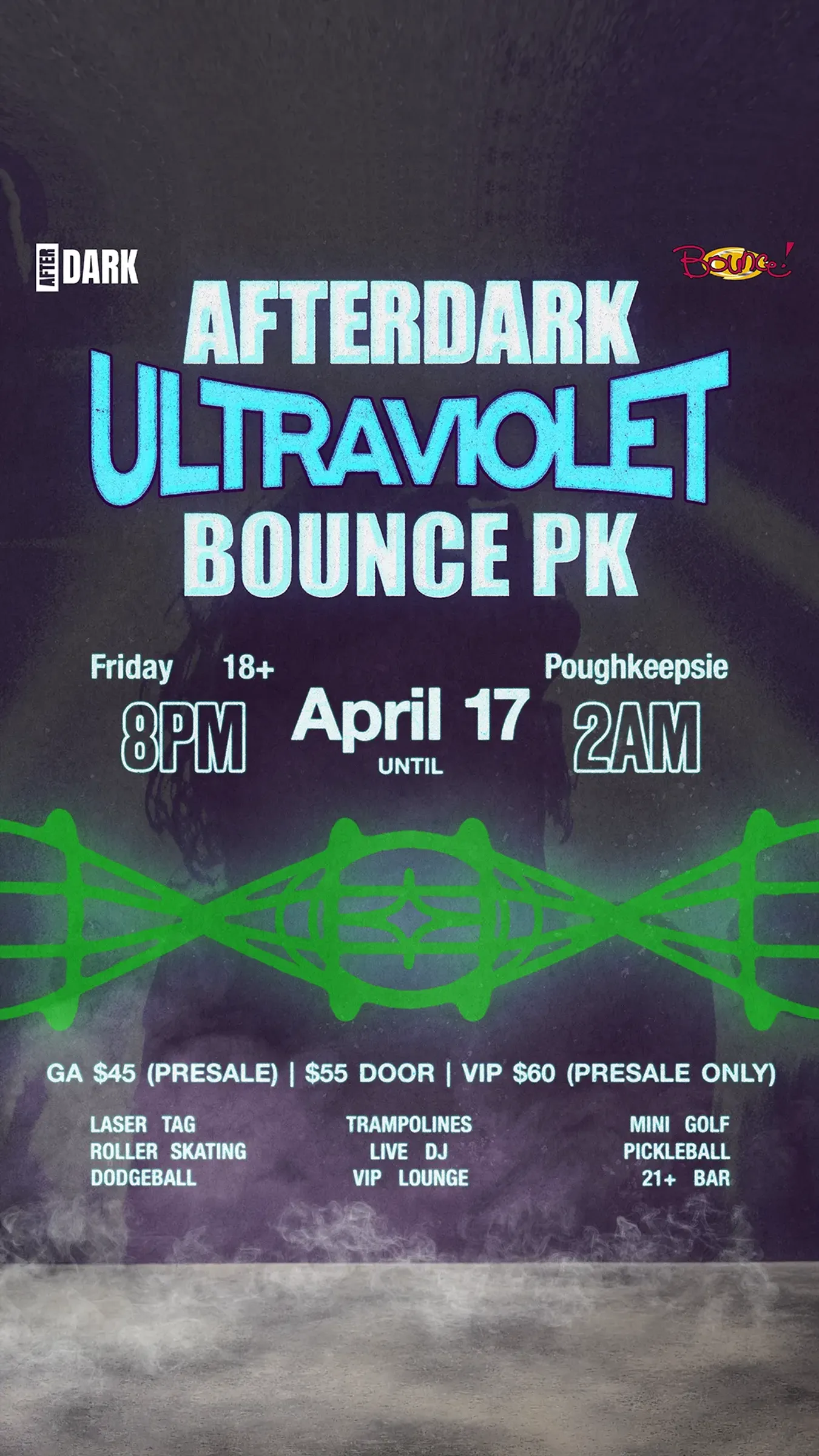 The Hudson Valley's biggest blacklight rave takes over Bounce Poughkeepsie on Friday, April 17th. One night. Six hours. Unlimited access to the entire facility under UV lights.
